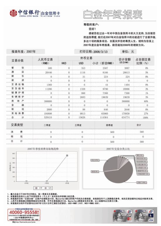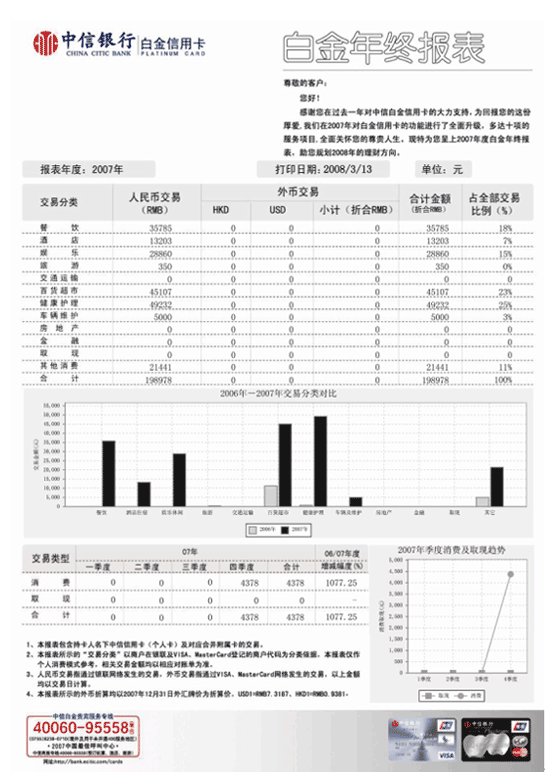 2008年的白金年度报表也进行了改版,新增了“2006-2007交易分类对比”、“2007年季度消费及取现趋势”、“2007年交易分类占比”等图表,您可更直观的了解您在2007年的消费结构,以及过去两年里的消费情况对比,助您更好规划今年的理财方向。