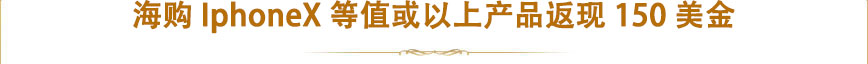 活动期间,中信万事达钛金卡持卡人在苹果境外官网(非cn后缀)成功购买Iphone X等产品(等 值US$999美金及以上产品),即有机会获得150美金返现,金额有限,先到先得。