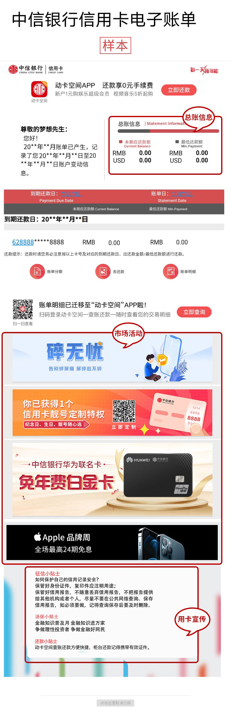 答:如果您选择了电邮账单,我行将于每月账单日次日起将您的中信信用卡电邮账单发送到您指定邮箱(当期无消费、取现交易不寄发账单),请检查您的收件箱(含订阅邮件、广告邮件、垃圾邮件)是否收到该账单。如未收到,可能是以下原因造成: