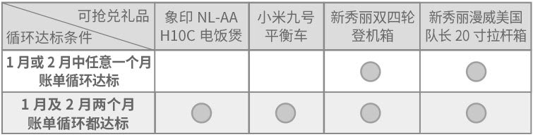3.循环达标需保证您本月账单循环金额-次月还款金额仍大于10000元;例如,假设您1月循环金额12000元,2月5日账单日,账单金额为18000元,则您在2月5日至2月最后还款日期间,还款金额需小于2000元,1月循环方可达标。参与活动的客户循环金额需保持至下个月还款日方可获得抢兑礼品的资格,如中途提前追加还款将取消礼品兑换资格。